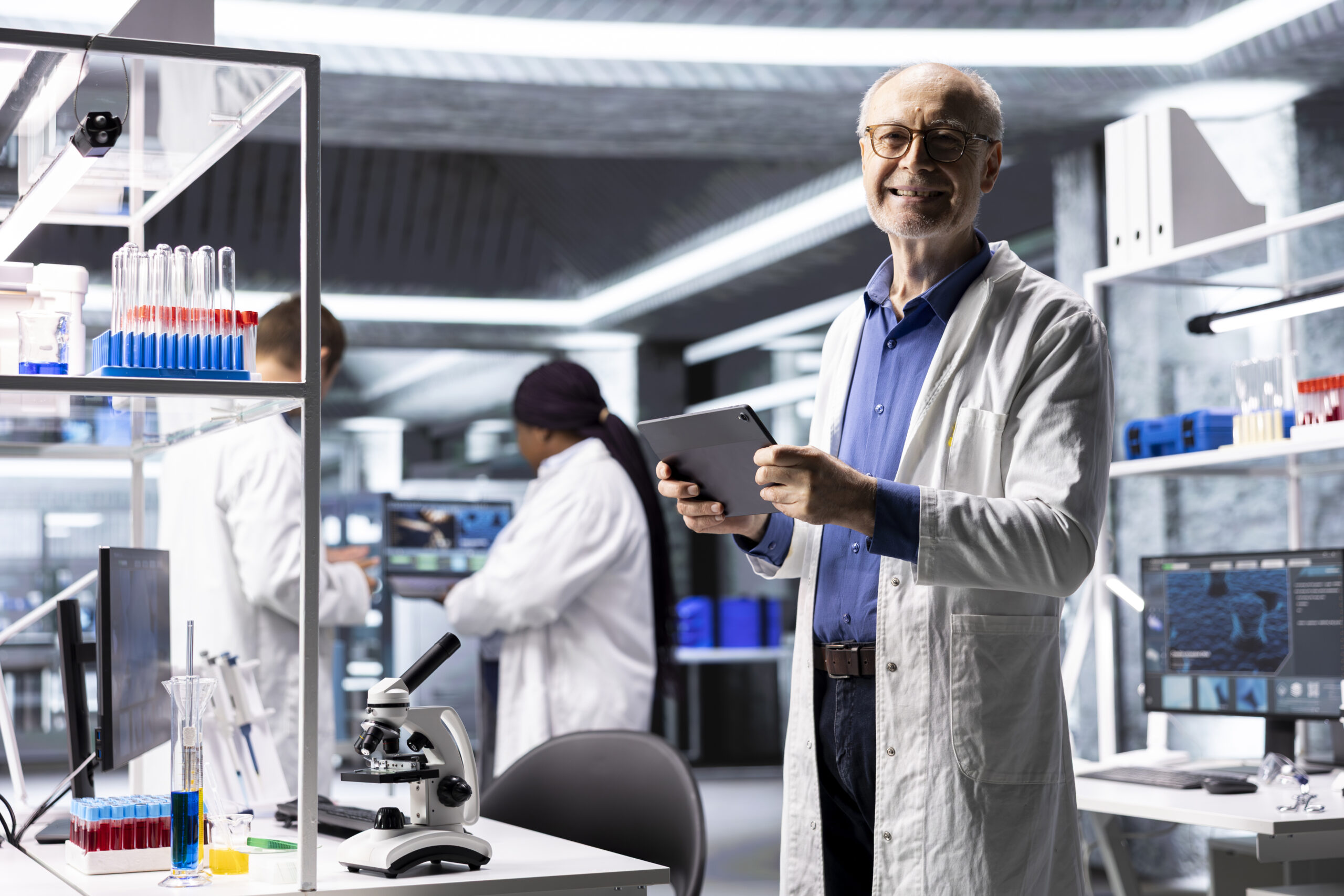 Male researcher focuses on experiment data in a research study. Laboratory equipment and chemical testing highlight biochemistry, genetics and bioengineering. Scientist work.