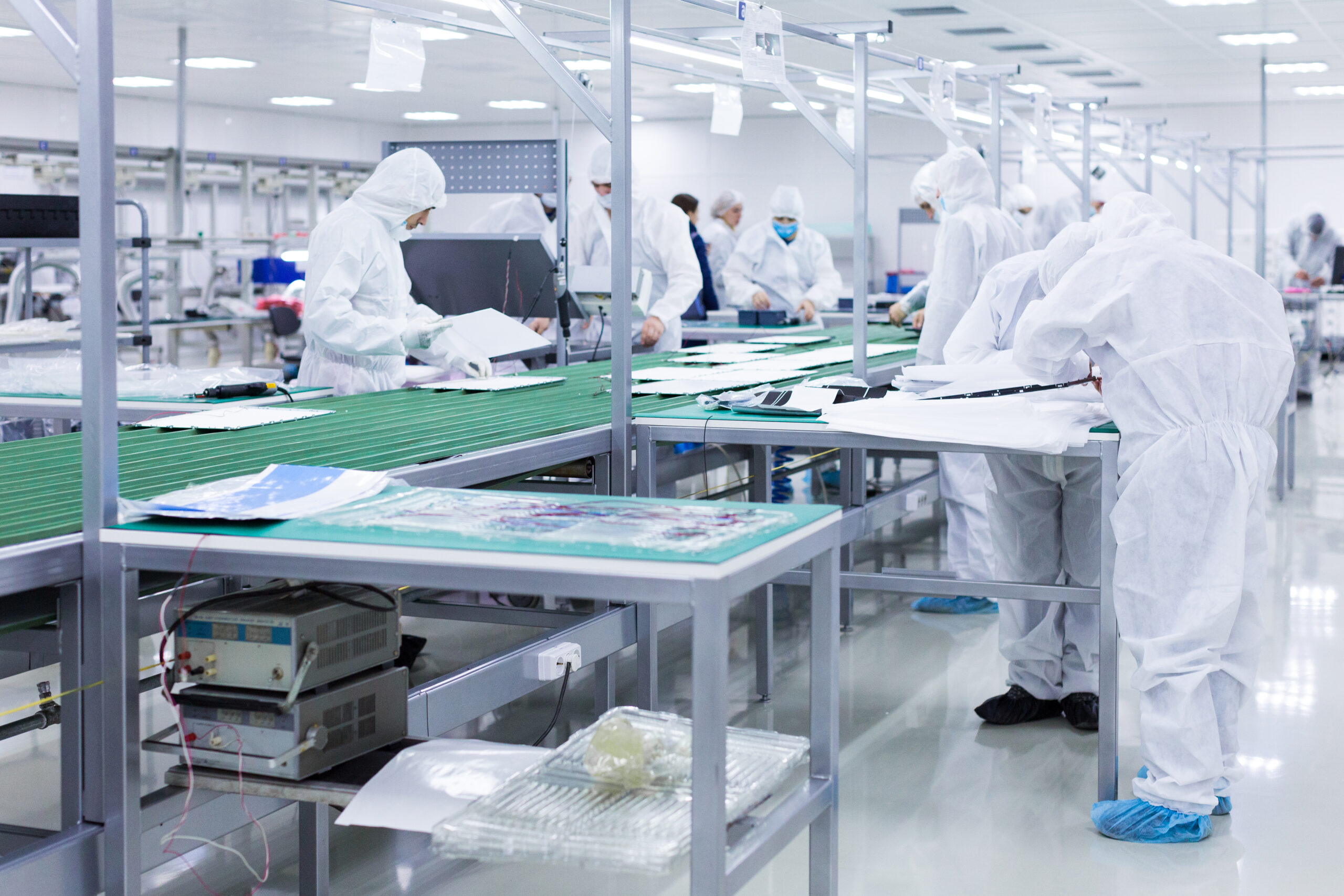 Pharmaceutical technicians work in sterile working conditions at pharmaceutical factory. Scientists wearing protective clothing