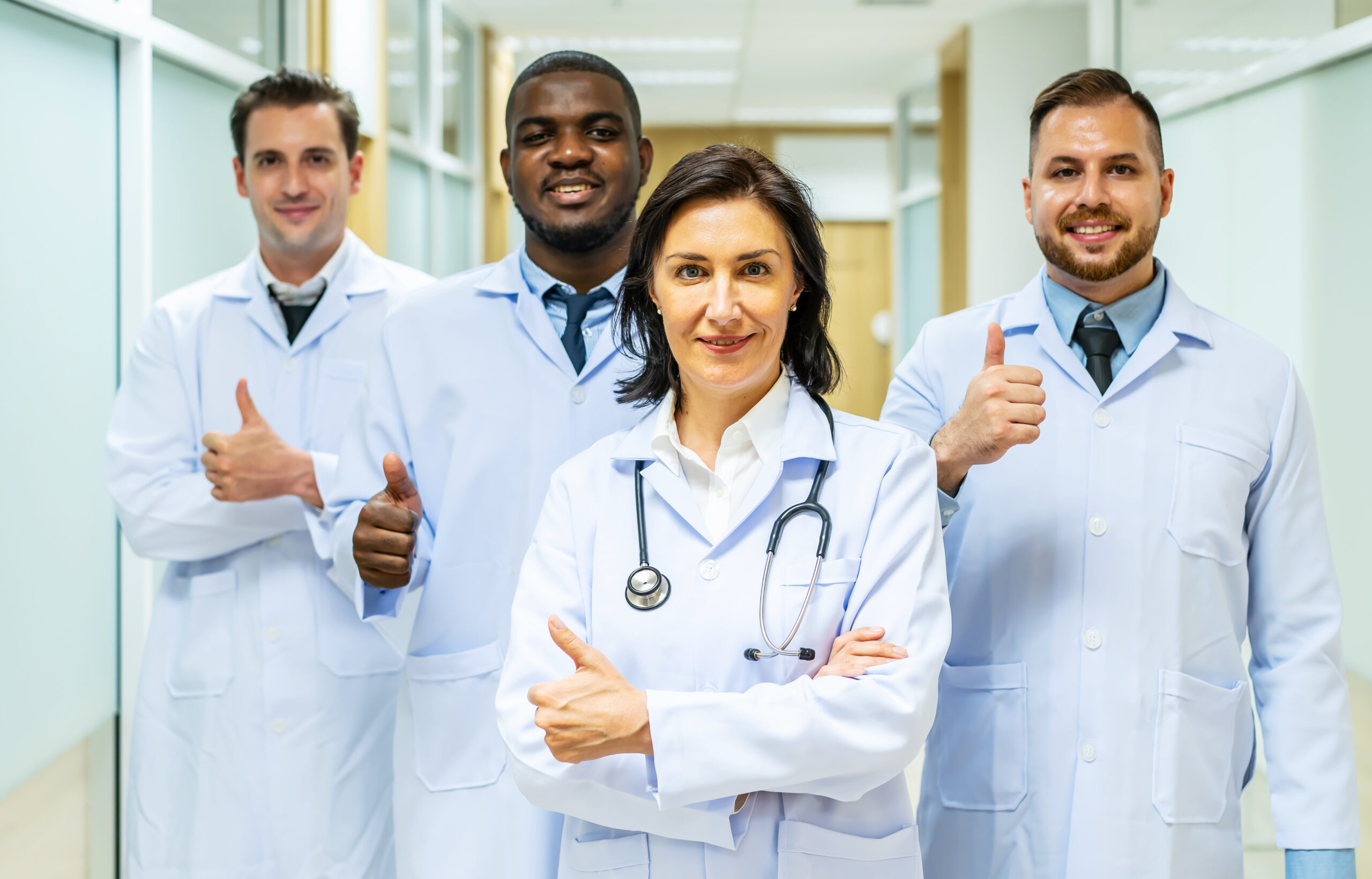 Portrait of successful team of medical doctors are looking at camera and smiling while standing in hospital